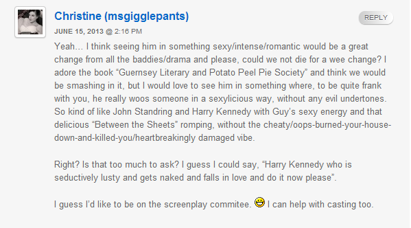 Is that too much to ask?  Like MsGigglepants I’d like to see him get the girl and live happily ever after.  Could it be that I want him to get this girl (meaning me) and live happily ever after with her (again, me)?  Hmm…something for further consideration in future.