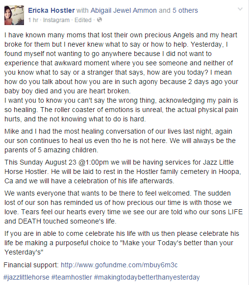 It is with a sad heart that we ask for your support at this time. Mike and Ericka Hostler, parents of five children said, good bye to their youngest baby, Jazz Little Horse Hostler.