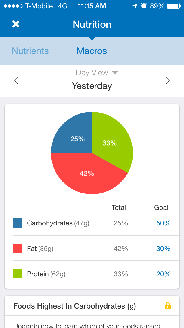 Keeping track of my food has forced me to face the fact that, regardless of my fitness goals, what I consume affects my body in ways seen and unseen. One of the things that I’ve found interesting is the importance of keeping track of the macros in one’s diet. What are “macros”, you ask? Macros short for macro-nutrients like protein, carbs and fats. These macros are the basis of all calories you consume. Rather than obsessing over calories, targeting macros helps keep you focused on food composition and overall healthfulness rather than just low-calorie options. And again, with the help of free apps like MyFitnessPal it’s easy to stay on track! (No, I am not getting paid to say so.)